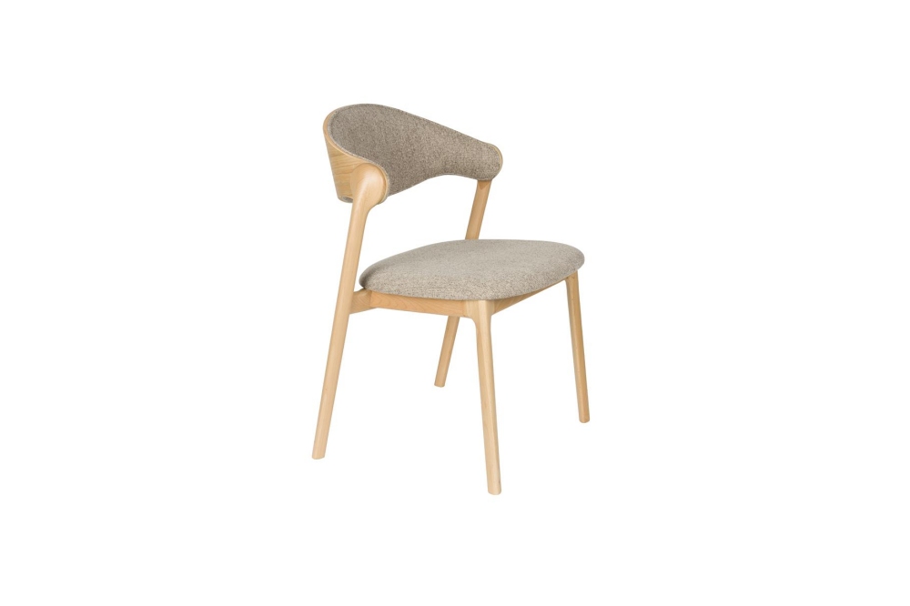 Het houten frame met naturel kleur is zo ontworpen dat het onderstel naadloos in de rugleuning overloopt, puur vakmanschap. De natuurlijke look van het hout steekt prachtig af tegen de lichte stof van de zitting en rugleuning. Bovendien biedt het zachte zitkussen een heerlijk comfortabele zit, ideaal voor lange diners in stijl.