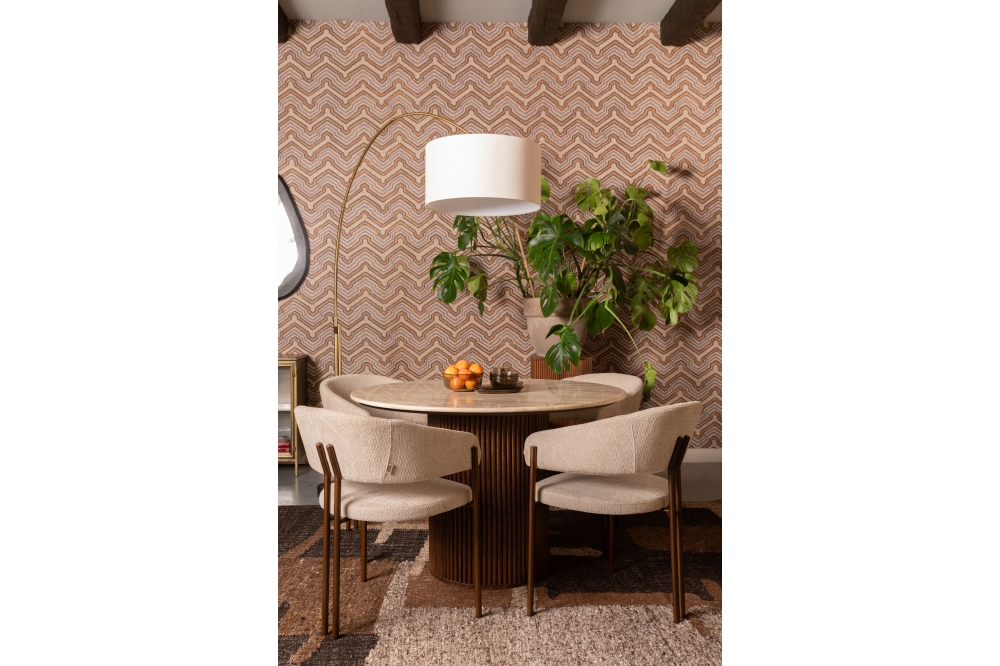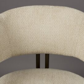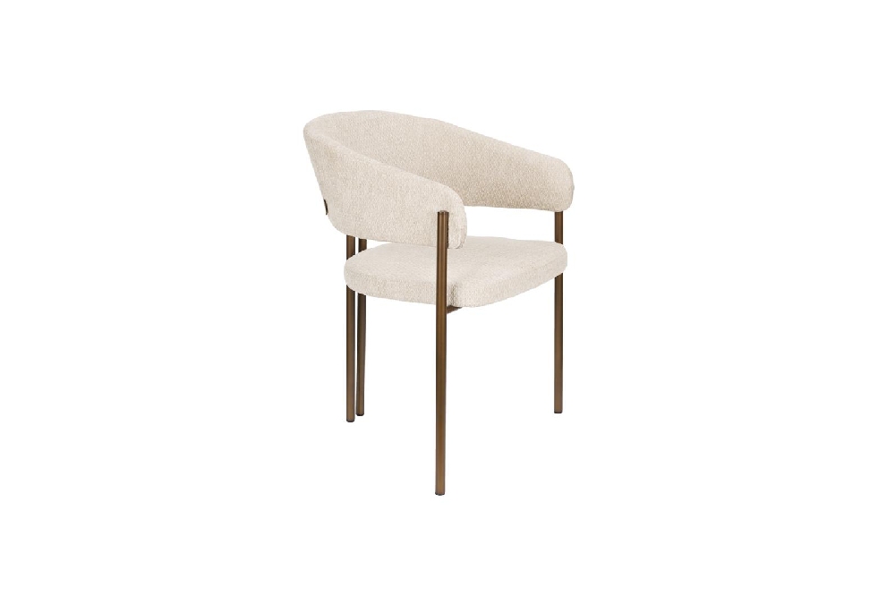 Het metalen frame heeft een bronzen afwerking en geeft daarmee zowel luchtigheid als warmte. In het frame rust een zitting en rugleuning, die beide rijkelijk bekleed zijn met bouclé stof in een warme tint. De zitting heeft bovendien een heerlijk comfortabele zit. Hierdoor is de stoel perfect voor een avond natafelen tot in de late uurtjes.