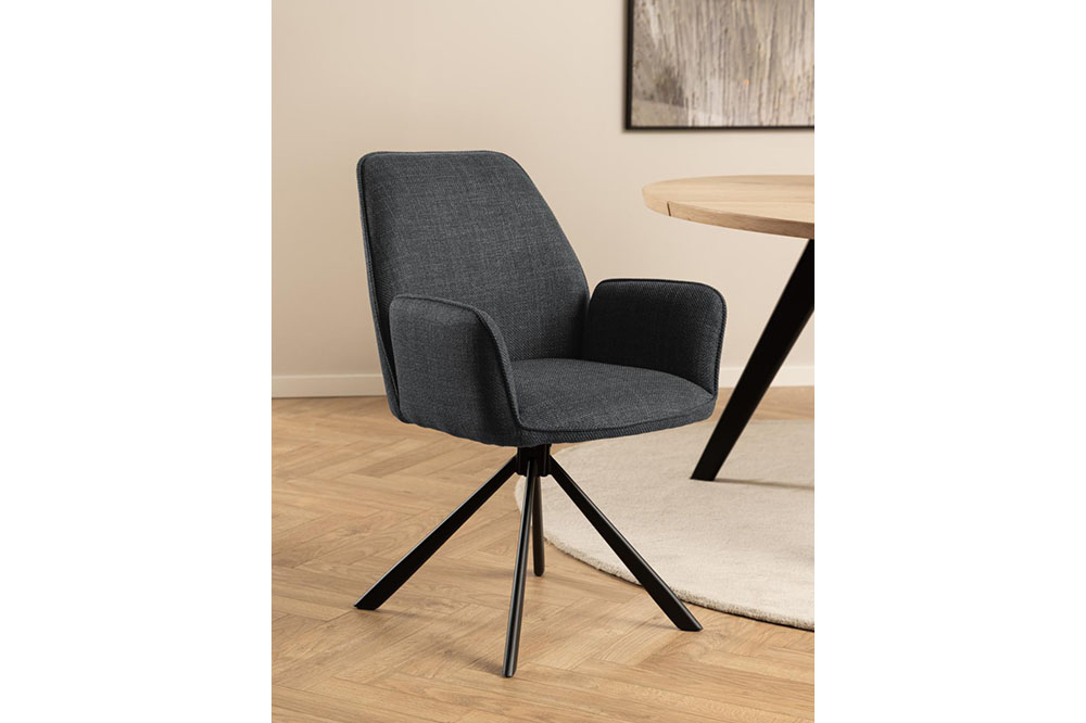 Dankzij de stevige 4-ster voet van zwart gepoedercoat staal biedt deze stoel niet alleen stabiliteit, maar ook een praktische draaifunctie. Hierdoor ervaar je extra bewegingsvrijheid aan de eettafel. De ergonomische armleuningen en zachte bekleding maken lange diners en gezellige avonden nog comfortabeler. De stoel is in diverse kleuren beschikbaar.