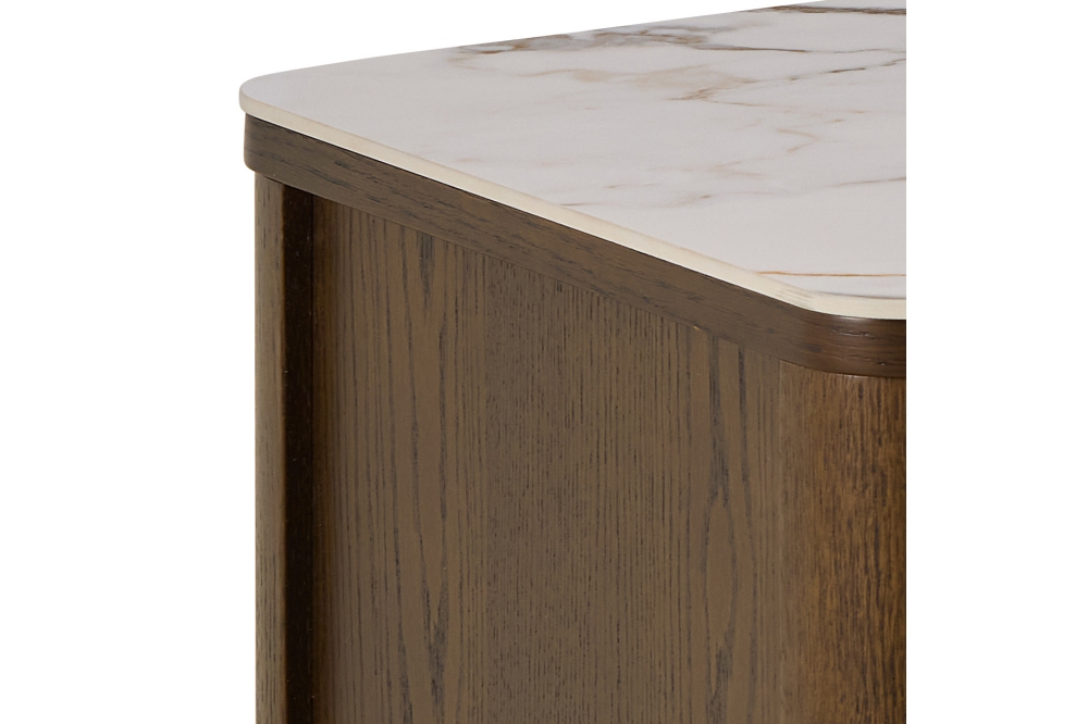 Het geheim zit in de verfijnde mix van gerookt eikenfineer en een crΓ¨me keramiek marmerlook blad met subtiele adering. Dit contrast zorgt voor diepte, warmte en een vleugje luxe zonder te overheersen terwijl de FSCβ’-gecertificeerde materialen garant staan voor kwaliteit Γ©n duurzaamheid.