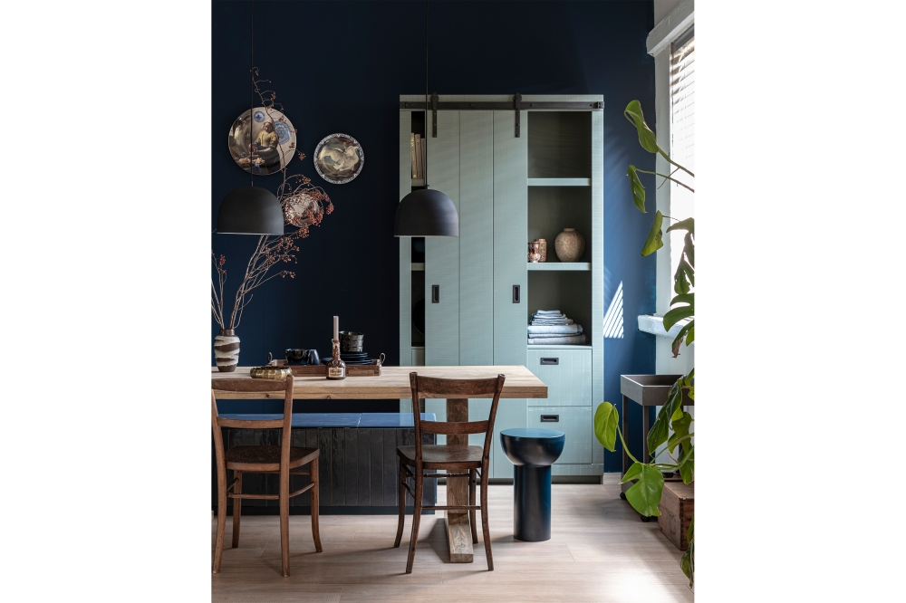 Aan twee zijdes heeft de Barn mooie dikke legplanken en daaronder twee royale lades. In totaal 4 lades. En je kunt zelf bepalen aan welke kant je de schuifdeur plaatst. De schuifdeur in metalen rail (kan van rechts naar links geschoven worden) geeft de kast een eigen identiteit. Barn is eigenlijk 230 cm hoog, maar omdat het beslag iets naar boven steekt komt hij op een hoogte van 232 cm. De kast wordt in 4 pakketen geleverd, als eenvoudig bouwpakket met een duidelijke montage-instructie.
